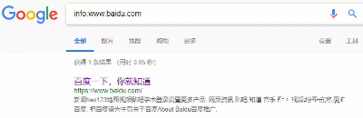 这个语法可以搜索到关于一个URL的更多信息的页面列表,这里的信息包括这个网页的cache,还有与这个网页相似的网页等等,注意下面的英文信息就好。输入“info:www.baidu.com”,结果如下图所示。