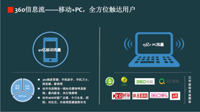 首先,优质的平台资源决定广告主优先选择360信息流作为最主要的推广渠道之一。360信息流产品整合了15亿+的PC流量及40亿的移动流量,全方位触达用户每个生活消费场景。