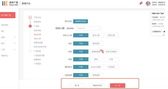 新建广告计划时,点击“下一步”后,顶部增加提示 “广告计划保存成功”,且进入下一步后不可返回到广告计划层级