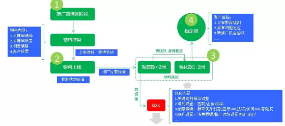 整体流程概述推广管理流程如下图所示,从图中可以清晰地看到一个账户推广前期的准备阶段到物料准备、物料上传、正式开始在线推广,再到推广进入一个观察测试期,之后是一个调整强化期,再到相对稳定期,到最后的 整体流程概述