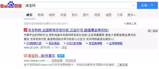 搜索淘宝网,看到第一名的是京东的百度广告位。