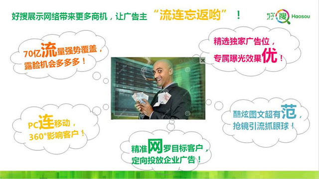 1、丰富:覆盖360导航、360搜索等众多流长尾理论量入口,丰富的展现位置和展现形式,满足企业的多样化需求。