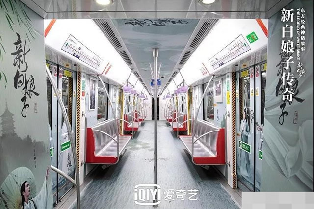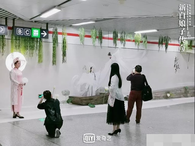 譬如对独播剧《新白娘子传奇》的运作,便是在故事发生地杭州打造出专属地铁通道、地铁专列、实景密室,并联动艺人实地打卡,组织白素贞coser进行快闪活动;线上剧集推荐区则会自动掉落“油纸伞”。