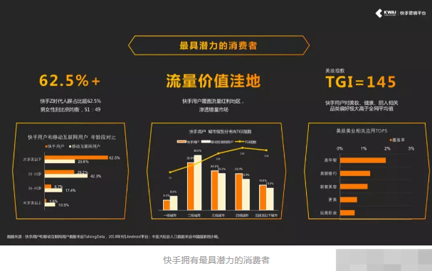 用户方面,快手的用户80%为90后,Z世代人群占比超过62.5%,男女性别比例均衡。和美妆用户的最新用户群高度重合。其次,下沉市场方面,一直是快手独特的优势。目前,快手人群三四线及以下城市覆盖人群高于全移动互联网用户,可以有效助力电商行业下沉市场覆盖的增速。换句话说,对美妆行业而言,快手是拥有最具潜力消费者、最具增长力的转化渠道。快手内部数据显示,快手上的美妆指数达到TGI=145,快手用户对美妆、健康、丽人相关品类偏好极大高于全网平均值。