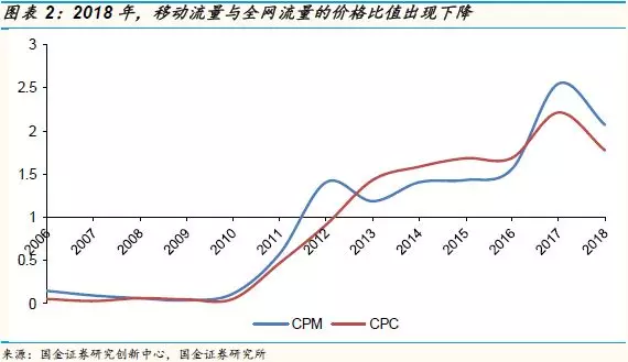 不仅移动互联网流量的价格在下跌,PC互联网流量的价格也在下跌,而前者的下跌速度快于后者。我们的独家监测数据显示:2012年以前,移动流量的CPM和CPC一直低于全网流量(全网包括PC端和移动端之和),此后则高于全网流量;2017年,移动流量与全网流量的价格比值达到了史无前例的2.2-2.5倍。这种现象并不奇怪:移动用户的使用时长高于PC用户、场景覆盖面广、方便进行数据分析,对广告主更有价值。到了2018年,移动流量价格下跌的速度也比全网流量更快,两者的价格比值回到了2.0倍左右。看样子,整个移动互联网行业处在重大的转折前夜。