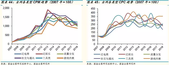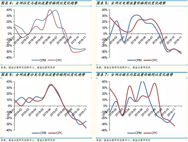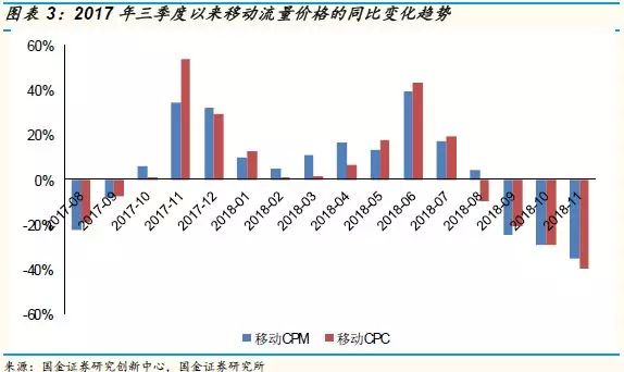 从月度数据,我们可以看到:2017年三季度,移动流量价格出现过短期的同比下跌,但是跌势很快就停止了。从当年10月到2018年7月,移动流量价格连续10个月同比上涨,再创历史新高。2018年8月,移动CPC开始回落;9月-11月,移动CPM和CPC连续大幅度同比下跌,我们估计12月仍将同比下跌。显然,这不是季节性因素。这也不可能是短期因素,因为自2016年初以来,我们从未观察到移动流量价格出现如此连续、猛烈的下跌。我们认为,原因主要是需求的大幅下跌。