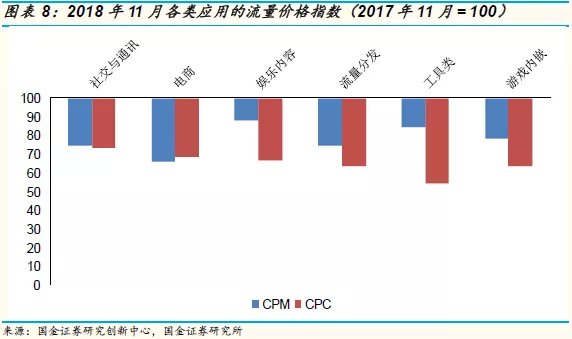 通过对个体应用的观察,我们发现:互联网流量价格下降的趋势是普遍的、同步的。我们将和移动应用划分为六大类型:社交与通讯,包括微信、QQ、等;泛电商,包括淘宝、京东、拼多多等;流量分发与资讯,包括、QQ浏览器、等;泛娱乐内容,包括、腾讯视频、抖音等;生活服务与工具,包括支付宝、输入法、高德等;游戏与衍生,包括游戏、游戏工具、游戏资讯等。在2018年上半年,以上六大类型应用的流量价格并没有密切的相关性,经常出现不同方向的变化;但是,从8-9月开始,所有类型的流量价格都出现了显著的下降。这说明,互联网行业确实出现了结构性问题:覆巢之下,焉有完卵?