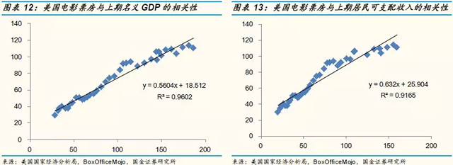 让我们吃惊的是,如果以年度数据为基准,美国电影票房收入与名义GDP、居民可支配收入、个人总支出等经济指标均存在强烈的正相关性。而且,电影票房收入与上一期经济指标的相关性更强,说明它存在一定的“后周期性”。无论采用当期经济指标或者上一期经济指标进行回归分析,决定系数(R-Square)均超过0.90,说明经济指标对电影票房具备很强的决定意义。所以,电影市场不存在任何“口红效应”!