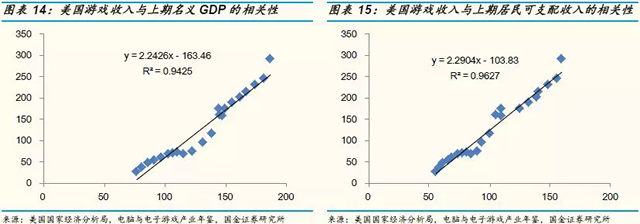 游戏行业的情况也差不多。美国游戏行业收入(包括主机游戏、PC游戏和移动游戏)与名义GDP、居民可支配收入、个人总支出等经济指标存在强烈的正相关性,相关系数和决定系数(R-Square)甚至高于电影票房收入。而且,游戏行业收入也存在一定的“后周期性”。换句话说,游戏行业的周期性比电影行业还要强,也不存在任何“口红效应”。