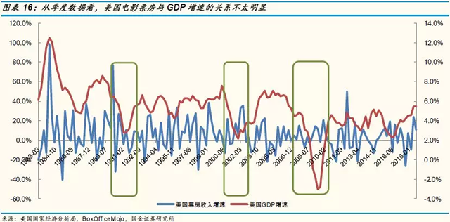那么,我们是否可以认为:在一定的时间范围内,传媒娱乐行业确实存在“口红效应”呢?绝不然!因为,我们的统计分析只能说明,若以季度为单位,电影票房收入与经济指标“没有相关性”,而不是“存在负相关性”。换句话说,传媒娱乐顶多可以被视为“非周期性”行业,而非“逆周期性”行业。在经济衰退时,它可能“不下跌”,但不会“逆势上涨”。