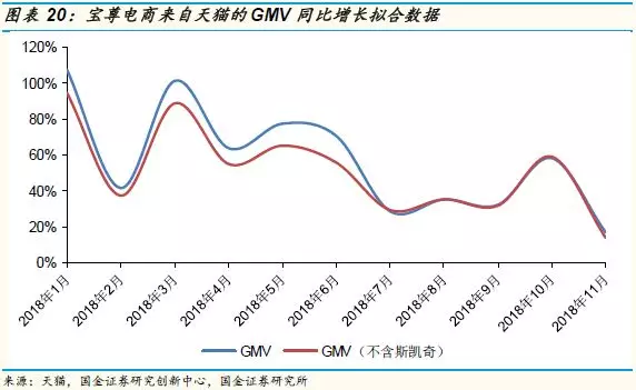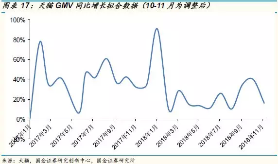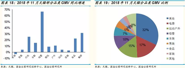 2018年11月,天猫的泛服装品类(包括女装、男装、童装、内衣、鞋帽、箱包、运动等)的GMV增速都很一般,其中女装甚至同比下滑。这不是好兆头,因为泛服装品类在历史上为天猫贡献了约1/3的GMV。母婴产品的GMV增速明显较高,可能受到了国家放开生育政策的持续影响。总而言之,今年“双十一”期间,只有美妆、电器、书籍、母婴四个品类的表现较好,其他品类的数据都没有什么亮点。