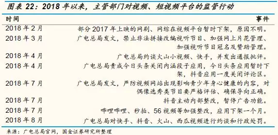 网络视频:包括长视频、在内的网络视频行业,2018年成为监管行动的焦点。火山、快手、抖音、西瓜、秒拍……几乎所有主流短视频应用都遭到了广电总局的约谈或行政处罚;在长视频应用中,B站受到批评之后下架一个月。爱奇艺、腾讯、等三大视频平台虽然没有受到处罚,但是也面临着节目审核趋严、选秀节目被严格监管、冠名及赞助强化管理等限制。视频行业面临的监管压力不是暂时的,而是持续的。监管风险爆发的形式包括:通报批评;罚款;暂停部分功能;下架部分内容;强化内容审核;暂时下架整个应用,等等。