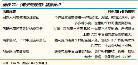 电子商务:部分投资者和媒体认为:在互联网细分行业中,电商行业受到的监管风险较小,因为它与文化内容和意识形态无关。然而,2018年8月通过的《电子商务法》说明:电商行业绝不是“世外桃源”,主管部门非常重视电商行业的合规和自律,今后的监管只会越来越严。