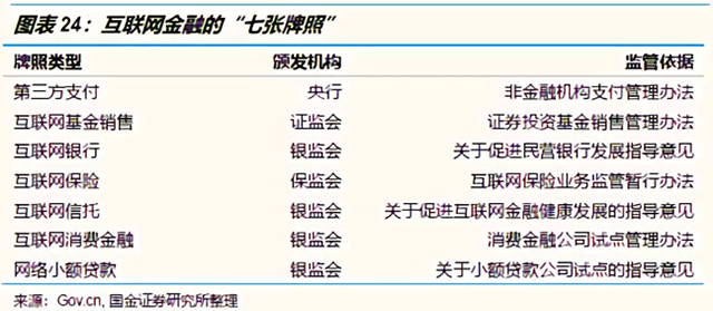 互联网金融: 2014年,“互联网金融”首次被写入《政府工作报告》;央行副行长李东荣表示,互联网金融是新生事物,要发挥它的正面作用。2015年7月,央行等十部门发布了《关于促进互联网金融健康发展的指导意见》,表示“支持互联网企业依法合规设立互联网支付机构、网络借贷平台、股权众筹融资平台、网络金融产品销售平台”。截止2015年,互联网金融的“牌照体系”基本健全,“一行三会”分别监管七张牌照。在执行过程中,央行强调“简政放权,适度监管”,地方金融办发挥着较大作用。