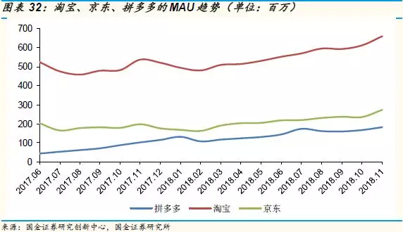 具体到拼多多,虽然现在仍然以微信为重要流量来源,但是早已走上了独立自主的“头部App”之路。我们认为,拼多多的用户增长势头还远远没有结束,因为整个电商行业的用户还在增长。在整个2018年,手机淘宝的MAU增长了1.2亿,手机京东的MAU增长了7500万;相比之下,拼多多的MAU增长了8000万(不含小程序MAU),在总量上反而不算什么。移动电商的用户渗透率本来就还有上升空间,虽然2019年会受到经济增速放缓的影响,但是全行业MAU还是可以做到温和增长的。