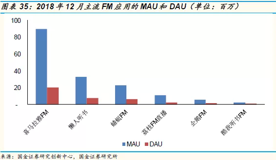 音乐不是唯一的音频娱乐形式,有声阅读和电台(移动FM)也是非常重要的。2018年12月,喜马拉雅FM的MAU已经逼近1亿大关,懒人听书、蜻蜓FM的MAU都超过了2000万。当移动用户的视觉被全面瓜分之后,他们的听觉就成为下一个瓜分对象,这个逻辑很通顺。不过,由于人们花在听觉娱乐上的时间远远少于视觉娱乐,市场规模也会更小。