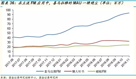 在所有主流移动FM应用中,喜马拉雅的MAU可谓一骑绝尘,在存量和增量上都远远超过了所有竞争对手。尤其是2018年三季度以后,MAU反而呈现加速上升的趋势,我们认为这离不开腾讯战略投资带来的协同效应。目前,腾讯对喜马拉雅的主要导流接口是腾讯视频,更多可能的协作方式尚未开启。在与腾讯加强合作之后,喜马拉雅的战略地位会更加稳固,移动FM可能像移动音乐行业一样被统一。