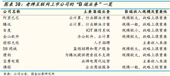 2018年四季度,腾讯、阿里两巨头都进行了组织架构调整,不约而同地加强了云计算和行业解决方案的重要性;它们下一步必然会加强对大型企业和政府客户的开拓。然而,对巨头们来说,B端互联网目前的市场规模还太小、利润率太薄弱,很难支撑它们2-3年内的收入利润增长。因此,它们在短期内仍将依靠C端业务为利润中心,将B端业务视为成本中心。原有的B端行业格局,暂时不会出现根本性的变化。