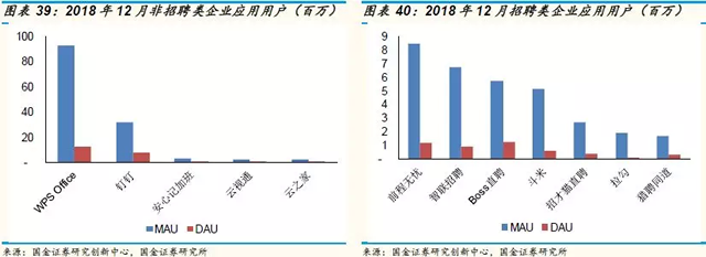我们的自有监测数据显示,2018年12月,数量最多、商业模式最成熟的“B端移动应用”是招聘类应用,其中已经产生了三个上市公司。在非招聘类B端应用中,用户基数最大的是金山软件旗下的WPS Office,其次是阿里巴巴旗下的钉钉。即便是所谓“头部B端移动应用”,其用户规模也是无法与C端移动应用相提并论的。不过,B端互联网并不遵循C端的“流量变现”商业逻辑,单纯比拼用户规模是没有意义的。