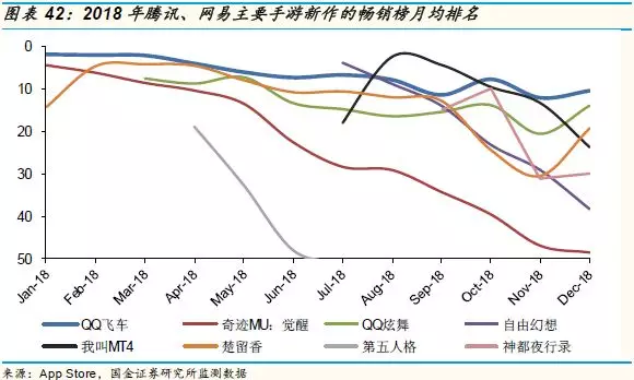 来自韩国的“吃鸡”玩法横扫市场,映衬了整个中国游戏行业的创新乏力。2018年,游戏行业面临的最严峻问题还不是版号暂停,而是头部游戏生命周期的缩短。例如,在腾讯发行的新游戏中,只有《QQ飞车》的App Store畅销榜排名比较稳定;《奇迹:觉醒》《QQ炫舞》《自由幻想》《我叫MT4》……衰减速度都很快,甚至沦为“一波流”。网易的情况也不算好,新游戏里只有《楚留香》在畅销榜前列停留了半年以上,被寄予厚望的《神都夜行录》仅仅保持了两个月的热度。