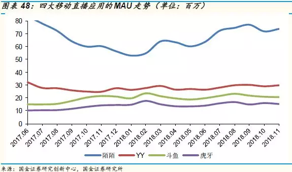 既然如此,直播平台在2018年的高增长是怎么做出来的呢?我们上文提到,抖音、快手等短视频应用的“溢出效应”起了非常大的作用,向直播平台输送了一批优质主播和核心粉丝;他们的数量可能不大,但是活跃度很高、变现能力强。此外,经过多年的探索,秀场直播的商业运营终于走向成熟,2018年成为ARPU提升之年。在经济增长放缓、却还不是很差的情况下,直播这种娱乐形式的吸引力并未下降。