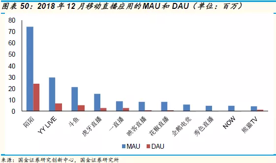 我们的自有数据显示:2018年12月,移动直播市场基本实现了“头部化”。MAU和DAU最高的是陌陌,但是陌陌用户只有30%左右观看直播,因此实际直播用户与YY大致相仿,两者共同占据统治地位。斗鱼、虎牙是第二梯队,其中虎牙的MAU看似低一大截,但是若考虑YY平台与虎牙共享的内容和观众,两者仍在同一量级。二线直播平台,无论秀场还是电竞,都已经被甩下很远。接下来,除了B站、抖音、快手等视频平台的直播功能之外,已经没有什么力量能对直播市场构成足够的扰动。