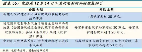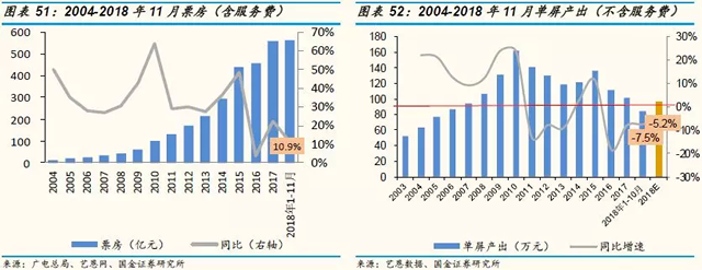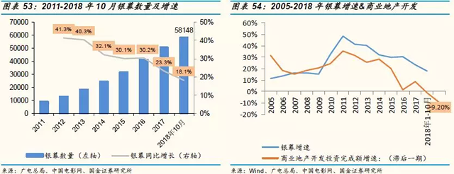 商业地产开发投资完成额增速在2017年首次出现负增长,2018年1-10月累计下滑9.2%,由于该增速滞后一年和银幕增速的关联度比较高,我们预计2019年的银幕增速可能放缓至10%。但是,政策变化使情况变得更为复杂:12月11日,电影局印发了《关于加快电影院建设促进电影市场繁荣发展的意见》,提出到2020年,全国城市银幕总数达到8万块以上,给予符合规定的新建影院每家20-50万元的补贴;2018年底的银幕总数约5.9万块,按照匀速增加计算, 2019年和2020年的银幕增速预计分别为17.8%和15.1%。如果该政策严格执行,预计2019年单屏产出下滑的趋势可能仍将持续。《意见》提出对乡镇影院、中西部地区县城影院以及安装巨幕、激光放映机等先进设备的影院给予重点扶植,上市公司受益的主要是三四线城市布局比较多的横店影视以及提供巨幕的IMAX China。