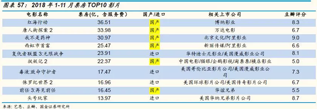 在内容方面,2018年国产片大放异彩。2018年1-11月票房前十的影片中,国产电影占到6部,且票房前四均为国产片,其中两部电影豆瓣评分超过8分。2018年1-11月,国产片占比高达63.9%,同比增长37.3%,进口片占比仅为36.1%,近十年来首次出现票房负增长,同比下滑17.4%。