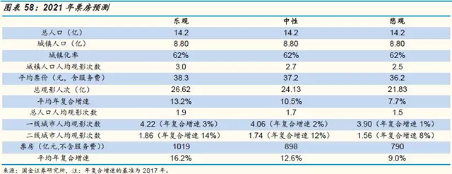从长期看,根据发达国家的数据,人均每年观影次数达到4次以后将保持相对稳定。我国2017年人均观影人次仅为1.16次,如果仅统计城镇人口的人均观影次数也只有1.99次。从结构来看,2017年一线城市人均观影人次达到3.75次,接近发达国家水平,2018年1-11月同比仅增长4.16%;二线及以下城市的人均观影2017年仅为1.03次,提升空间还很大,2018年1-11月同比增长8.54%。从2018年1-11月的数据看,一线城市的票房占比降低至19.2%,三线及以下城市的票房占比提升至41.4%。我们预计到2021年在乐观、中性、悲观三种预期下总票房分别为1019、898、790亿元,以2017年为基准年复合增速分别为16.2%、12.6%、9%。