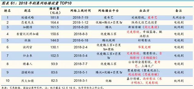 2018年剧集播放量不及2017年,网络剧上升趋势显著。截至12月16日,全网排名第一的《延禧攻略》累计播放量182亿次,而2017年的《楚乔传》《三生三世十里桃花》累计播放量均超过450亿次。主要是由于2018年执行限古令、多部大剧推迟播出、题材撞车等因素导致。从结构上来看,网络剧上升趋势显著,爱奇艺定制剧《延禧攻略》实现了先网后台的播出形式,《如懿传》改为纯网剧以后也获得了播放量第三的排名。