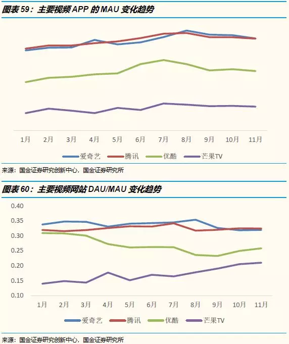视频网站2018年竞争格局相对稳定,活跃度来看芒果TV提升显著。从我们监测的月活来看,四大视频网站都在波动中呈现上升趋势,竞争格局趋于稳定。目前主流视频网站的付费渗透率尚不到20%,考虑到奈飞的付费渗透率超过95%,我们认为国内视频网站的付费渗透率还有很大的提升空间。从DAU/MAU反映的活跃度来看,芒果TV提升显著,主要是2018年湖南卫视和芒果TV推出的综艺流量增长显著,剧集方面暑期档的新版《流星花园》也成为了同档期的爆款。