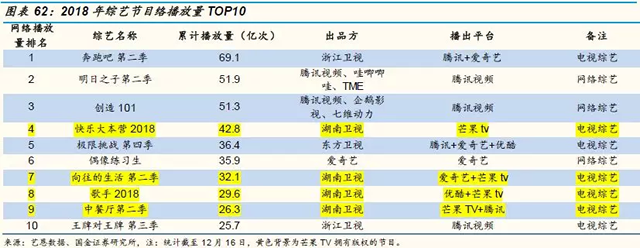 2018年头部综艺腾讯领跑,芒果TV整体市占率领先。在头部的自制综艺里,腾讯和爱奇艺优势显著,优酷的自制综艺相对比较弱。在播放量前十的综艺里,芒果TV(含湖南卫视)占据4部,前20部中占据9部,接近半壁江山。除了湖南卫视的老牌综艺以外,芒果TV出品的纯网综艺流量上升显著,《妻子的浪漫旅行》、《妈妈是超人第三季》、《勇敢的世界》、《我想和你唱第三季》等节目均有不俗的表现。