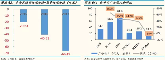 假设2019年现金流缺口不增长的情况下,爱奇艺账上的现金只够烧4个季度,实际上在3个季度内就需要启动新一轮的融资,而且每年融资额要保持100亿元左右的规模。参考奈飞的融资方式,爱奇艺发债融资的可能性比较大,如果百度支持力度不及预期,爱奇艺可能面临重大的资金危机。此外,爱奇艺的广告收入在2018年Q3首次出现同比和环比的负增长。视频网站的竞争格局可能会在2019年底发生翻天覆地的变化。