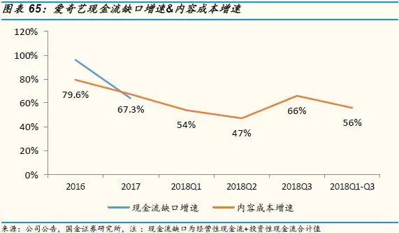 三大视频网站血战,爱奇艺可能在2019年率先出现资金危机。从下图我们可以看到爱奇艺从2015年开始,现金流缺口(经营性现金流+投资性现金流)不断扩大,2017年为负66.5亿元。过去3年半,爱奇艺累计融资389亿元,平均每年融资111亿元,远高于奈飞(过去8年平均融资10.8亿美金)。我们预计爱奇艺2018年的现金流缺口增速为50%,达到99.8亿元。爱奇艺不披露季度现金流量表,但是我们根据资产负债表测算,2018年三季度现金流缺口为39亿元,剔除掉投资天象互娱支付的现金(我们估算约10.6亿元),剩余的现金流缺口为28.4亿元。