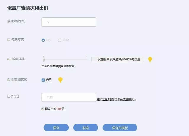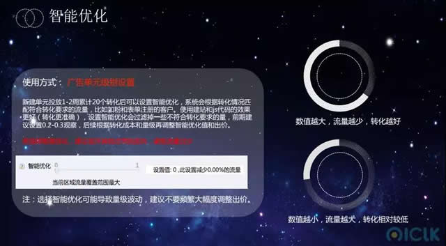 设置智能优化会过滤掉一些不符合转化要求的量,前期建议设置0.2-0.3观察,后续根据转化成本和量级再调整智能优化值和出价。若选择智能优化,建议放开其他过窄的定向,避免流量过少,出现跑不出去的情况。