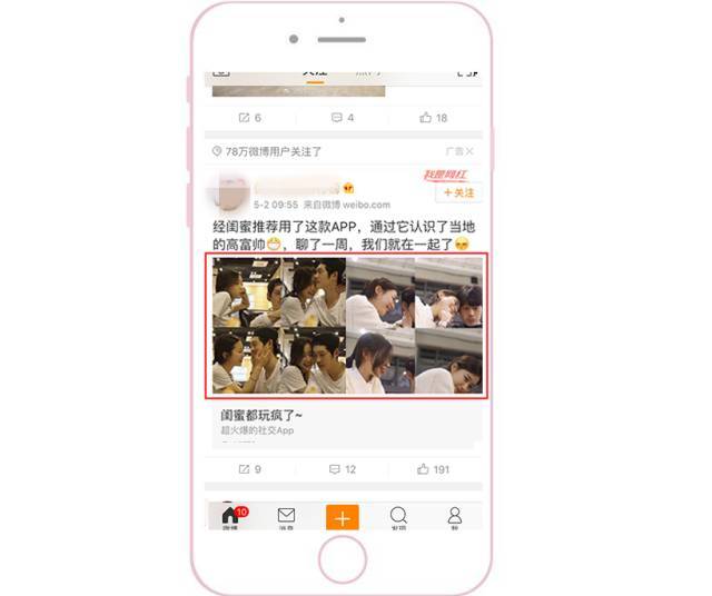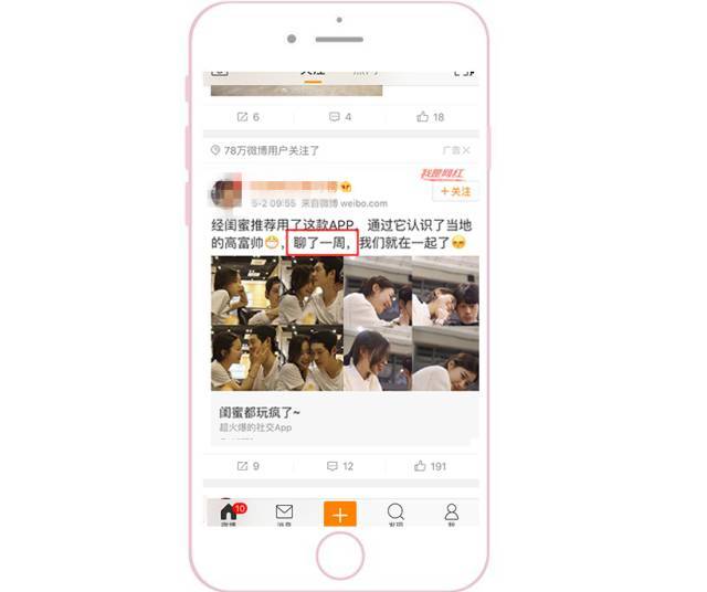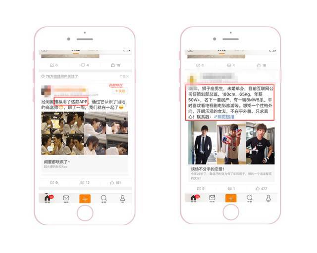 >反面案例:下图右图中文案没有点明这是个APP。所以用户点击链接后,发现不是跳转到获取这个男的联系方式的,而是直接转到App Store,心理落差会很大。感觉被骗了就不下载了,所以这个广告实际率不高。