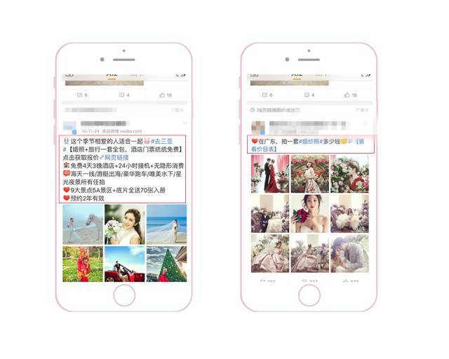 (1) 侧重点差异化。例如:下面左图的文案,对结婚紧迫感还金华网站推广不是很强的群体会更有吸引力;右图的文案,对将要结婚的群体会更有吸引力。也因此,左图的受众会比右图的更广一些。