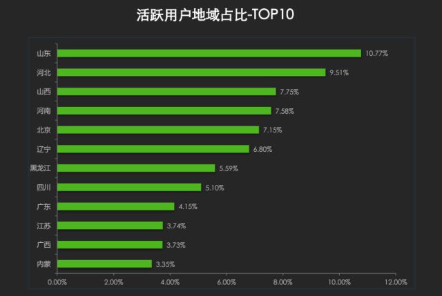 趣头条的用户大部分集中在18-40岁之间,男女比例3:7,具有消费能力的用户居多!集中在非一线城市且北方为主。以北方地区居多,山东地区最多,其次是河北、河南、北京、山西、辽宁。