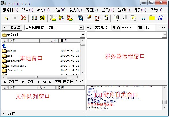 最后回到软件界面,填写您的FTP主机地址、FTP账号和密码连接上传就可以了,如下图: