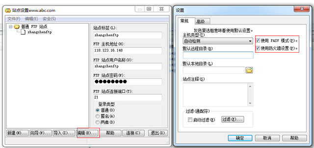 2、点击“文件”--“站点管理器”,选择您的站点--“编辑(E)”,在“设置"选项,勾选 使用PASV模式(P)和使用防火墙设置(F)确定,最后点击“连接(C)”即可使用代理连接。
