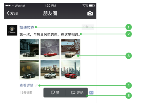 朋友圈广告将会通过微信广告系统进行投放和管理,广告本身内容将基于微信公众账号生态体系, 以类似朋友的原创内容形式进行,在基于微信用户画像进行定向的同时,依托关系链进行互动传播。
