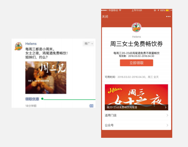 朋友圈有多种推广形式,满足不同推广需求:推广信息、活动信息、公众号、应用下载、卡券和本地门店服务(如餐饮、培训)