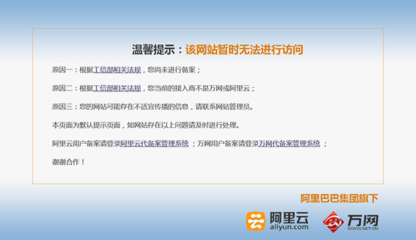 如果不备案就访问域名的话,就会出现下面这张图上的。提示三种可能性,第一,需要备案;第二,接入商不是万网或者;第三,网站有不适合公开的内容。