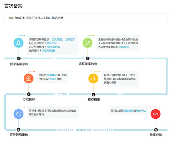 登陆beian.aliyun.com这个网址,根据提示注册账号,整个备案流程见下图: