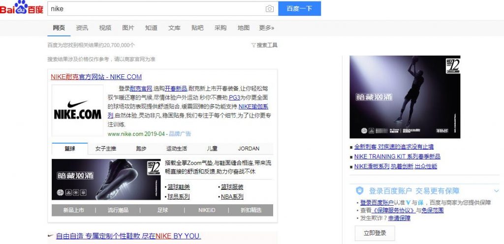 3.创建更多优质内容页面内容是搜索引擎排名的一个重要因素。尽管为营销建立一个迷你网站是一个好的开始,你需要继续为你的网站添加新的相关内容。 等式很简单:你拥有的内容越多,你可以部署的长尾关键词就越多,这反过来会增加你的自然搜索流量。 长尾关键词更有针对性,通常有竞争力较低的关键词群,让你找到合适的人口统计数据。例如,大学应该考虑在其现有网站上增加更多相关的高质量内容页面,如课程页面和学校新闻。随着时间的通过,百度将该网站视为该特定主题领域的目的地,这将增加他们在SERP中的内容,并帮助潜在学生轻松找到他们。 对于化妆品和补充品品牌等消费品,最好专注于为支持产品或公司整体产品的关键词创建内容,例如,通过写关于活性成分的健康益处或基于产品的植物地理区域的重要性。由于时间确实是建立搜索引擎优化权所需要的,所以更好的做法是关注常青树主题来创建新的内容页面,这将提供长期的好处而不是季节性的活动,例如一天的活动,并且更适合付费广告系列和社交媒体活动。 4.在商业伙伴网站上推广在寻求开展业务时,长期合作伙伴关系将获得各种形式的回报,这也是在网站上提升更高质量流量的有效方式,它超越了上述反向链接策略。 商业伙伴非常适合交叉推广活动,因为目标受众往往会重叠。为了使这种促销有效,通常最好设计一个特殊的广告系列,在有限的时间内为您的业务伙伴的客户提供独家折扣或限量版产品。 然后,您的业务合作伙伴可以通过他们的社交媒体渠道和eDM网站上的醒目横幅来宣传这一优惠,以换取奖励,例如通过这一活动进行的每笔销售的佣金。 5.从事搜索引擎营销(SEM)搜索引擎营销是给网站带来流量的另一种方式。与微信和视频广告相比,流量质量更高。虽然它可以有效地覆盖目标受众,但也可能非常昂贵。百度的开户起价为7000元。你还需要一个营业执照和网站的所有权证书。 这就是为什么我们通常建议只在非常特殊的促销活动中使用扫描电镜,如电子商务活动或特殊活动。 百度有不同类型的付费搜索广告、品牌区域广告(如下面显示的耐克示例)和常规关键词广告,它们都将显示在搜索引擎排名页面的自然搜索结果上方。