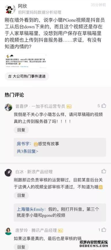 10月30日傍晚,沉寂已久的李小璐PGone“做头发”出了第二季,两人暧昧比心亲嘴视频曝光。#李小璐PG One#tag刹那间攒上了热搜,又在网络引起热议。 随后,PGone发长文质疑李小璐视频疑似抖音泄露。称&ld营销推广新产品quo;为什么去年在抖音拍的视频没有任何外传的前提下会被放出来还没有logo?”然而,抖音对PGone质疑坚决不背锅,回应媒体查询予以否定。 质疑抖音泄密草稿箱的视频 去年夜宿门东窗事发后,PGone遭到全面封杀,李小璐和贾乃亮离了婚,闺蜜马苏“辟谣”帮两人圆谎遭打脸。 如今,PGone发长文解释,没想到是去年的旧视频泄流出。他发微博长文叫冤,表示与李小璐亲密视频系去年3、4月份所拍,两人在彼此最痛苦的时候相互鼓励扛过最阴暗的时期,的确产生过感情。他声称该视频疑似为抖音后台草稿并未发出,质疑“为什么去年在抖音拍的视频没有任何外传的前提下会被放出来还没有logo?”他声称,自己的视频是在没有任何外传的前提下被放的,如果此次泄露事件是由于抖音内部员工导致,这说明抖音没有立即删除相关音视频,并且已经明确违反了它所制定的隐私政策。 ![]() 尔后有网友爆料,传李小璐PGone视频为抖音员工泄露。该网友声称,李小璐PGone视频是抖音员工从后台down下来,而且这个视频还是存在于人家草稿箱里,没想到用户保存在草稿箱里的视频也上传到抖音服务器。 ![]() 《“抖音”隐私政策》列明,“为了提升音视频的上传速度,缩短等待时间,当您发布音视频时,在点击“发布”确认上传之前,我们可能会将该音视频临时加载至服务器。如果您取消或因其他原因未成功上传,我们会立即删除相关音视频。&r语文教育dquo;创新思维看来,用户确认上传前的短视频,确实会临时加载至抖音的服务器。 以前曾有媒体报道,在通讯录未包含任何信息、也没有明确同意收集使用通讯录的情况下,“字节跳动”旗下产品“抖音”和“多闪”两款APP向用户推荐微信好友。而且,在未经明确同意下,“抖音”就向“多闪”提供了用户在抖音上的个人信息。对此,抖音发布回应称,“抖音”“多闪”产品在运营过程中,合规合法,一直在法律允许范围内收集、使用、共享个人信息。 然而,草稿箱视频泄露与抖音服务器暂存上传视频是两码事。 假如PGone质疑抖音泄密为真,众网友则担忧网络隐私随便被侵犯的危险。但是,这种质疑遭到抖音官方否定。 抖音危机公关回应:“传言不实” 就网传抖音用户草稿箱视频被泄露一事,抖音官方对各家媒体回应称“传言不实”,并否认了草稿视频会上传至后台。抖音方面强调,运营审核后台没有任何草稿视频,不存在抖音员工从后台下载草稿箱里传视频的可能。其它情况,还在继续核实。 既然抖音坚决不背锅,那么李小璐PGone亲嘴视频是谁传上网络?有吃瓜群众猜测,难道是当事人为了咸鱼翻身,上传视频自我炒作?相信真相不久将水落石出。