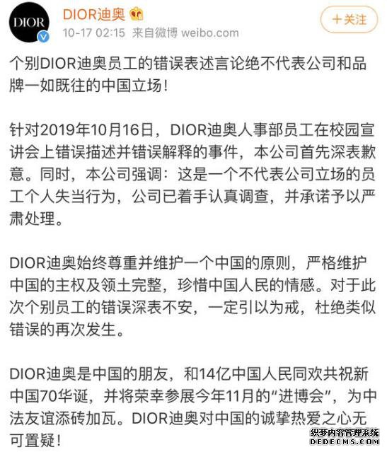 10月19日,在宣讲会用错地图而登上热搜的Dior再次上榜,而此次的原因却有些出人意料:Dior在其2020春夏成衣系列秀场闭幕派对上放了播放《我和我的祖国》。派对上演“红歌行动”,Dior这次的被批“用力过猛”? 一直以来,Dior的闭幕式派对都汇聚了各路时尚人士,各种霓虹闪烁、时尚前卫。而一曲不适宜的《我和我的祖国》,不得不联想到Dior宣讲会用错中国地图一事。 10月日,Dior在中国某高校开展了校园宣讲会时,一张PPT中中国地图缺失了某个小岛部分。随后引发台下的学生不满,当现场学生对此提出质疑后,Dior工作人员却以“某个小岛太小了,所以没有显示在地图上”回答,企图“蒙混过关”。在被学生反问质疑后更是偷换概念,称Dior将香港和某个小岛合称“G产品推广情况reat China”,在生意地图上相对于中国大陆,香港和某个小岛是两个独立的区域。Dior工作人员前后一系列“迷”一般的回答自然是没有得到认可,其解释过程的视频也被传到网上,引起一片哗然。 对此,Dior官方日凌晨迅速发布了道歉声明,指出该员工关于宣讲地图的描述及解释均为错误的,同时还表明了公司在维护一个中国原则方面的立场。道歉结束后,为了弥补自己的错误,才出现了派对放《我和我的祖国》这一稍具“戏剧性”的场景。 ![]() Dior官方道歉声明 纵观Dior近期的一系列行为,小编认为此次Dior对于危机事件的反应速度确实值得肯定。可以说在今年这个众多品牌因对中国主权的错误认识而纷纷“翻车”的大环境下,Dior的及时处理在一定程度上是控制了大众负面情绪的进一步发酵,在一个舆论环境相对冷静的时候摆出态度,将其对待中国领土完整的正确立场清晰地传递给了大众。甚至有网友评论称这次是Dior的及时公关将Dior品牌形象拉了回来。 但就对Dior在这整个事件中所采取的行为,小编仍持着褒贬参半的立场。首先从其能诚恳地发布道歉声明,敢于认错,第一时间站出来接受批评这一点来说,Dior确实赢得了公众的好感。但派对上演“红歌行动”,是否有些“用力过猛”? 不可否认,Dior在party上放《我和我的祖国》确实是放弃了其以往派对的风格,以一种有些“蠢”的方式展示着自己的诚意,获得了部分网友“满满求生欲”的评价。可同时也有部分网友对这一点提出了不小的质疑。《我和我的祖国》这类歌曲本就不适合Dior派对这类场合,强行“红专”到底是在道歉还是在“高级黑”?整体来看,这类模棱两可的处理方法对于Dior诚意的展示实际上是有一定削弱作用的。 ![]() Dior秀场派对放《我和我的祖国》存在不解 品牌出现危机事件,第一时间把握问题及时回应,这自然无可厚非。但在后续危机公关的处理方式上,Dior任需要慎重选择,并非一首《我和我的祖国》就能解决危机的根源,态度先行,行为也得匹配跟上。