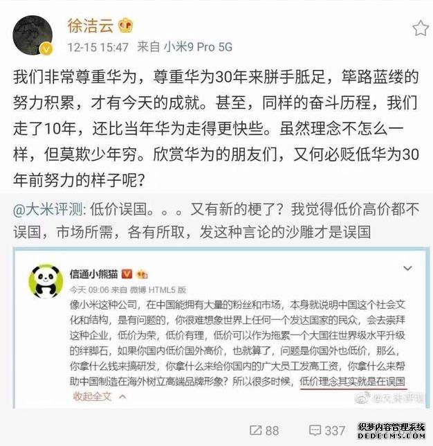 12月14日,微博用户发文对小米的低价模式进行了攻击,他表示小米这个公司拥有市场和粉丝是社会文化和结构的问题,更是表示小米低价会成为拖累国家向世界级水平的绊脚石。最后还来了一句:低价就是在误国。 ![]() 反观作者强大的逻辑,用低价来攻击小米不免有些可以诋毁了,尤其还带上如此沉重的话题,这难道不是低端无脑黑吗? 在此番言论引起巨大争议后,小米以及红米方面自然也不例外,红米总经理卢伟冰在12月15后也是撰文吹起了反击的号角。 ![]() 在文中,卢伟冰还表达了华为的崇拜之情,他表示,深度研究了华为的发展路径,熟读任总讲话以及任总在不同阶段关于手机战略的榜样,华为是中国企业“低价”的榜样,最后更是特别强调友商某型号手机最低型号是399元。 不得会展危机公关的作用不说,卢总的回复真的是有理有据。 首先肯定了中国的社会文化和结构,然后po出小米的财报,研发等。当然最重要的一点就是表扬了友商华为,不仅表示华为是“低价”的榜样,更是连具体价格都写的清清楚楚。 其次肯定了价格低是市场的需求。生产的成本越低,企业和生产者(小米是代工)的获利空间就会越大,价格维持在在一个大众都可接受的水平才节俭宣传片能催生新的市场需求,刺激企业的研发动力。 但一个公司因价格问题竟然能背负救国误国的重任,那真的是高看它太多了。一些商家高价低配,利用品引流方式的选择牌的影响力,利用广告的轰炸把一些“电子垃圾”卖给丝毫不懂的小白,赚取高额利润的行为这才是可耻的。小米产品质量过得去,只是利润低,又不是没利润。要知道误国的不是低价的产品,而是劣质低价的产品,这个才会造成驱逐现象。
